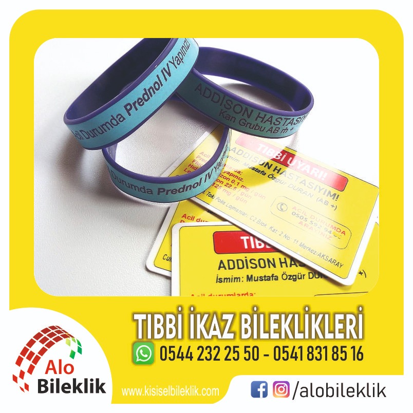 Tüm kalıcı riskli bilinmesi zorunlu rahatsızlıklarınız için istediğiniz yazıyla bileklikler üretim hizmeti vermekteyiz…